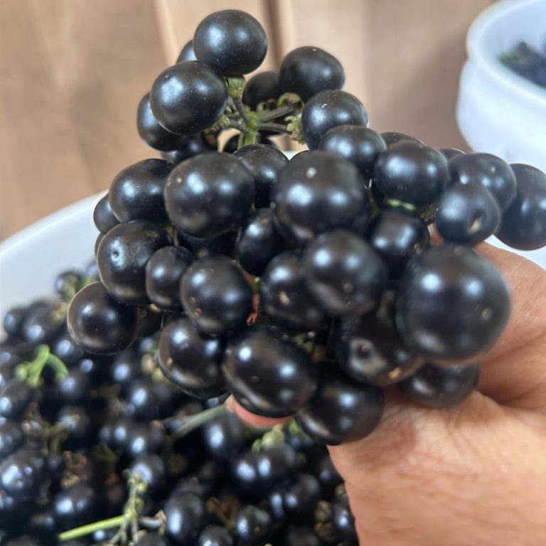 Have you ever seen berries so big? Consistently, the bushes produce large berries. Harvested the day after our first hard frost made them much less tart. This year the harvest was 14 gallons from 21 bushes. Huckleberries- if you haven't tried these garden variety, are ripe when the skin is completely black and dull. They are very tart before cooked. When cooked they become sweeter, with intense wild berry, floral, and blueberry notes.